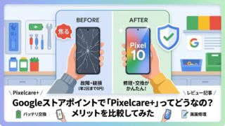 ぼくくん「GoogleストアのセールでPixel 10買ったよ!スマホってこんな高いよな!?命綱のスマホ壊れると困るし、保証をどうしようか迷ってて……。」ともだちくんあ、新しくなったPixel Care+でたよね!画面修理が0円になったのは...