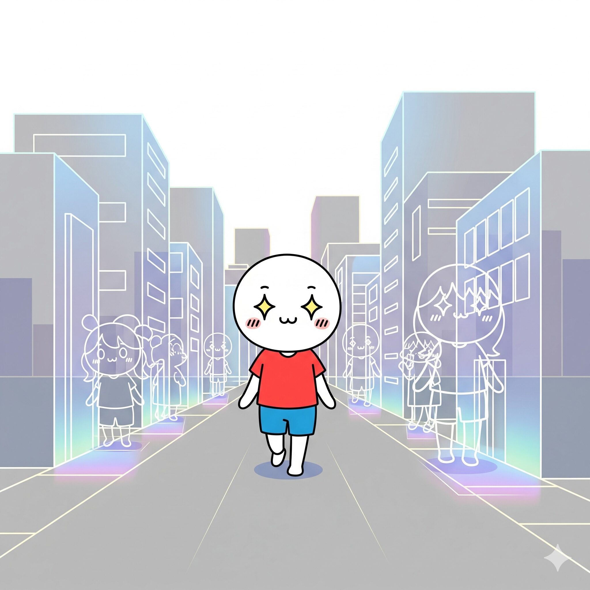 ある朝、H田は通勤途中に不思議な光を見つけた。それは、街のどこにもないはずの「丸み」を持った、小さな光の玉だった。H田がそれに触れると、彼の指先が、まるでデータが消去されるかのように、光の中に吸い込まれて消えた。彼は驚き、悲鳴をあげた。だが、ホログラムでできた周囲の人々は、彼の異変に気づかない。